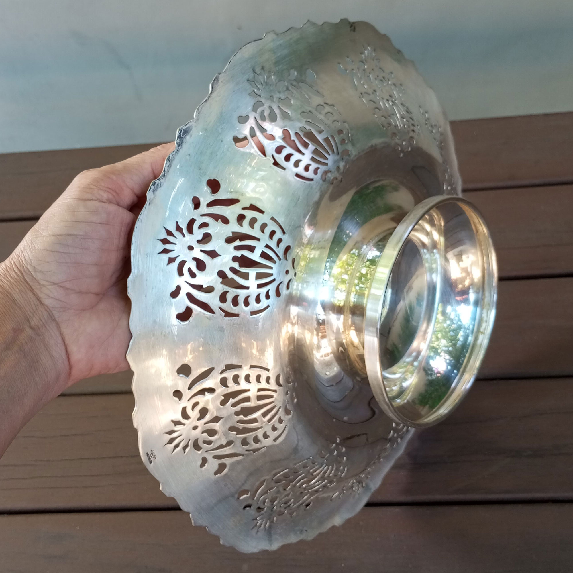 Lindíssima e imponente fruteira feita em metal espessurado a prata da marca Wolff, em muito bom estado de conservação, apesar de haver alaguns pequenos arranões, como pode ser visto nas fotos. A peça é, provavelmente, do final da década de 1940. Medidas: 30 cm de Diâmetro por 8 cm de altura. Peso: 578 g.